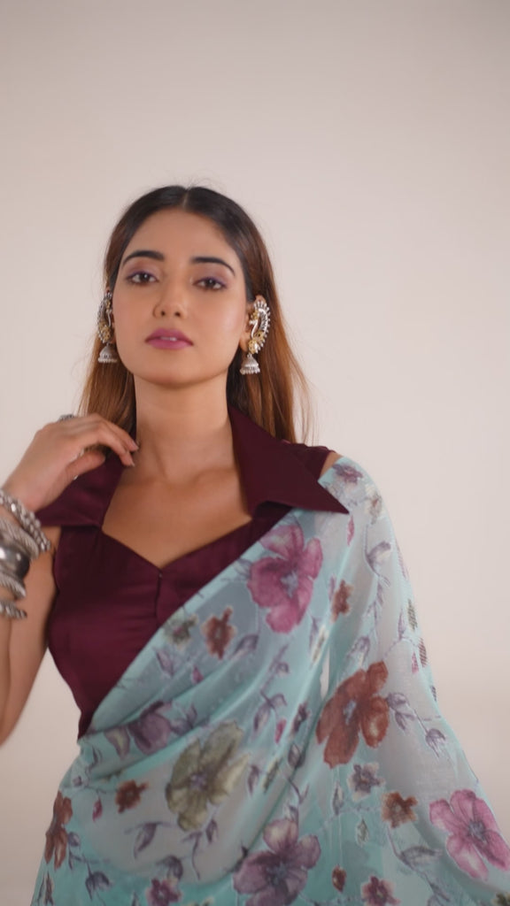 This graceful saree features a soft, lightweight fabric adorned with a beautiful floral print that adds a refreshing and timeless charm.